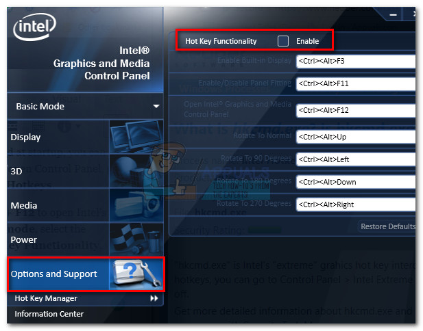 If you have the newest Intel software, you can press Ctrl + Alt + F12 to open Intel’s Graphics and Media Control Panel. Then, enter into the Basic mode, select the Options and Support tab and uncheck the box next to Hot Key Functionality.