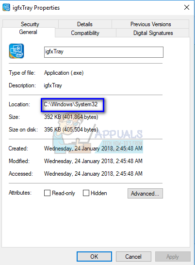 - Under the “General” tab, check if the location of the executable is “C:\Windows\System32”. The location is one of the main things which give away a fake program.