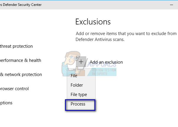 - There are several ways through which you can exclude a process. You can use the full path name, just the name of the process or put a star in the extension space of the program. After adding the extension, restart your computer and check if the problem at hand got solved.