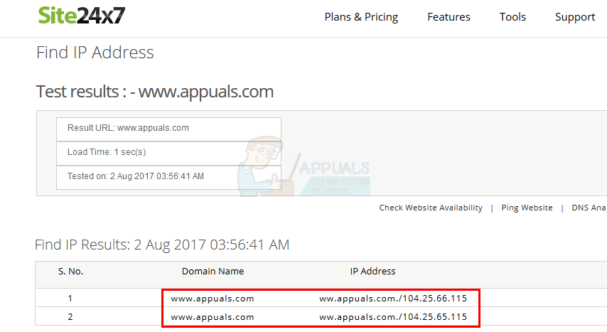 site24x7: This is another website that revolves around the IP Addresses. However, this website will help you find the IP Address of a specific website. Ever wonder what the IP Address of the appuals is? Just go to the site24x7, enter www.appuals.com and click Find IP. The website will show you the IP Address of our website. This website will be useful for people who don’t know the specific IP Address of a website.