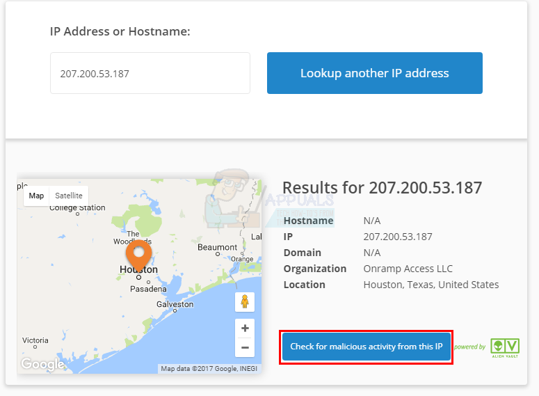 You will see a button called Check for malicious activity from this IP on the result page. This button will basically check whether the domain name or the IP address you searched for has been flagged or not. The IP address will be checked against the Alien Vault’s Open Threat Exchange (OTX).