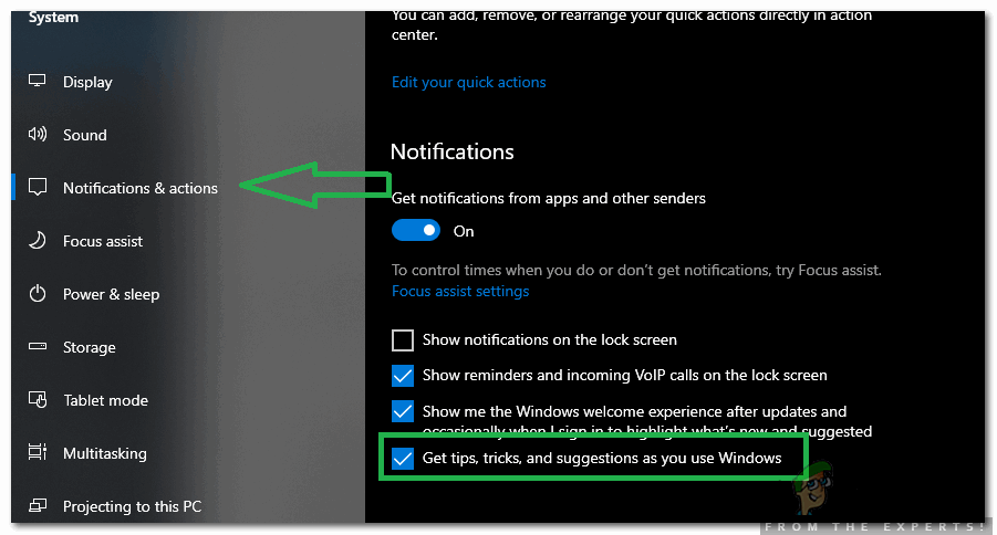 - Turn the “Get Tips, Tricks, and Suggestions as you use Windows” option off by unchecking the box or pressing the toggle.