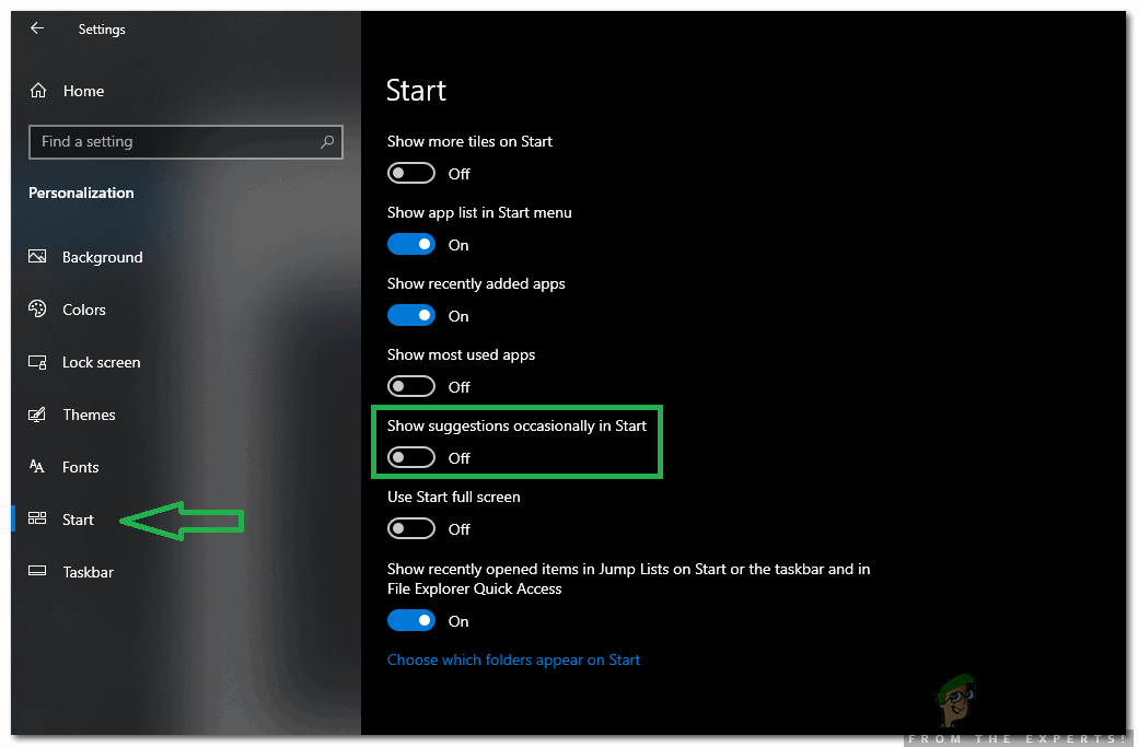 - Click on the “Start” option from the left and turn the “Show Suggestions Occasionally in Start” button off.