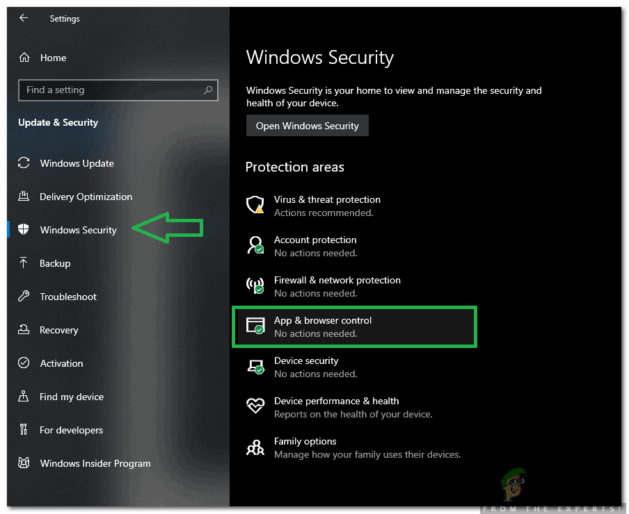 - Select “Windows Security” from the left pane and click on “App and Browser Control“.