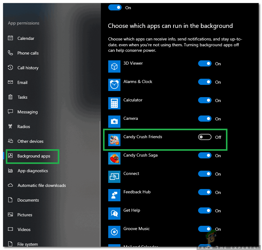 - Select “Background Apps” from the left pane and turn off the toggle for all the unnecessary apps.