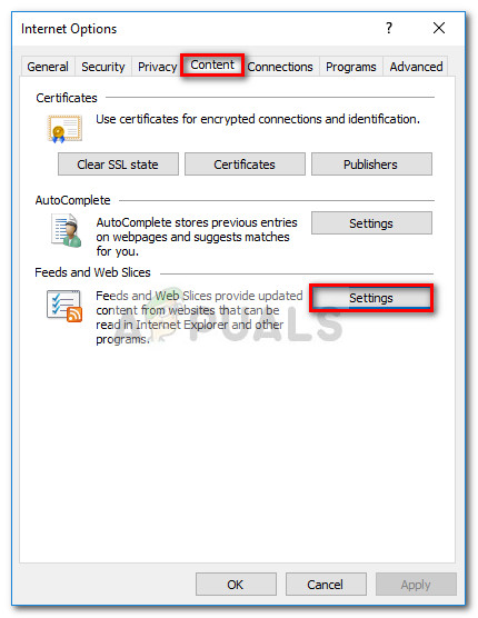 - In the Internet Options window, expand the Content tab and click the Settings button associated with Feeds and Web Slices.