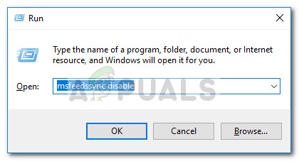To do this, press Windows key + R to open up a new Run window. Then, type “msfeedssync disable and hit Enter.