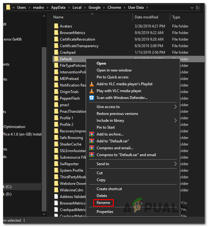 - Right-click on the Default folder and choose Rename from the newly appeared context menu. Rename the Default folder to Default2 or something different, to force Chrome to create a new folder at the next startup.
