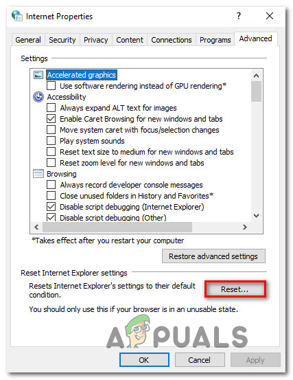 Opening the Internet Properties screen - Once you’re inside the Internet Properties screen, go to the Advanced tab and click on the Reset button at the bottom of the screen.