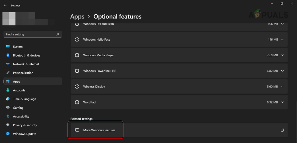 Open Optional Features in the Apps Tab of Windows Settings - Then scroll down and under Related Settings, click on More Windows Features.