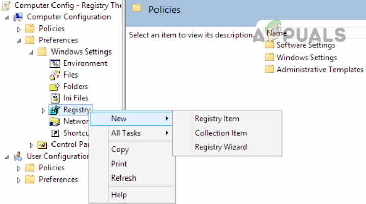 - Now, in the left pane, right-click on Registry and select Registry Item.