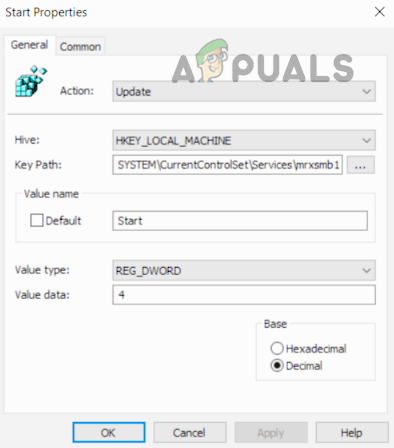 Action: Update Hive: HKEY_LOCAL_MACHINE Key Path: SYSTEM\CurrentControlSet\services\mrxsmb10 Value name: Start Value type: REG_DWORD Value data: 4