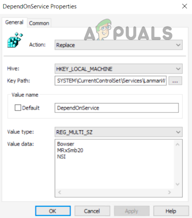Action: Replace Hive: HKEY_LOCAL_MACHINE Key Path: SYSTEM\CurrentControlSet\Services\LanmanWorkstation Value name: DependOnService Value type REG_MULTI_SZ Value data: Bowser MRxSmb20 NSI