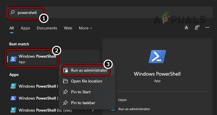 - Click Windows, search for PowerShell, right-click on it, and in the sub-menu, select Run as Administrator.