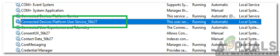 Entering “services.msc” and pressing “Enter” - Find the Connected Devices Platform User Service in the list.