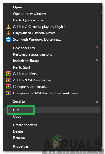 - Right-click on the “MSOCache” folder and select “Cut“.