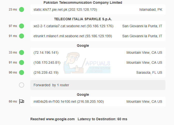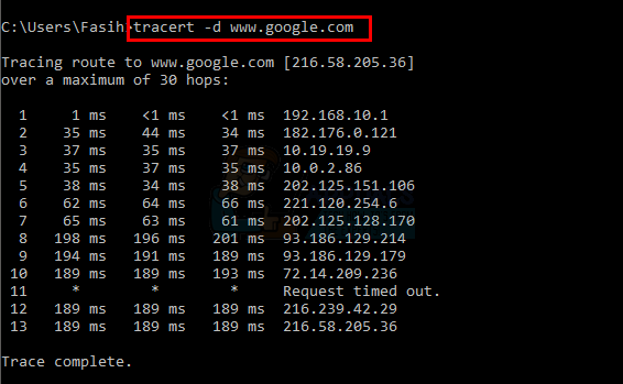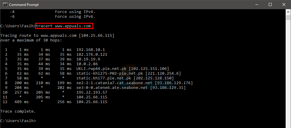 - You can try with the hostname as well. This is actually more useful since we aren’t in a habit of memorizing the IP Addresses. Type tracert www.appuals.com and press Enter