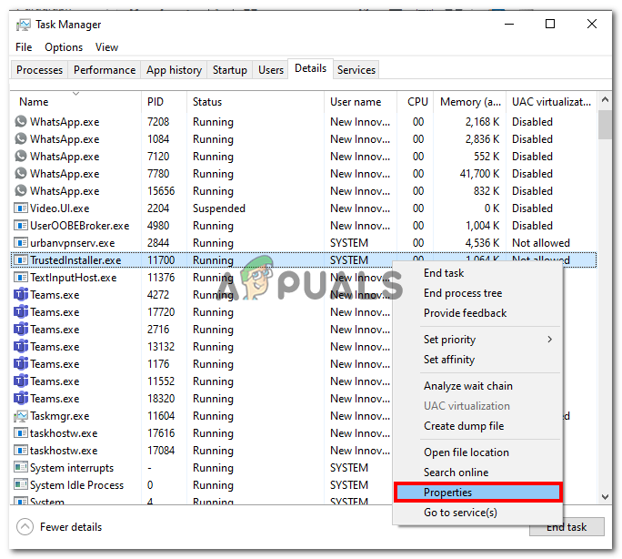 - Right-Click on TrustedInstaller.exe and click on Properties in the context menu.