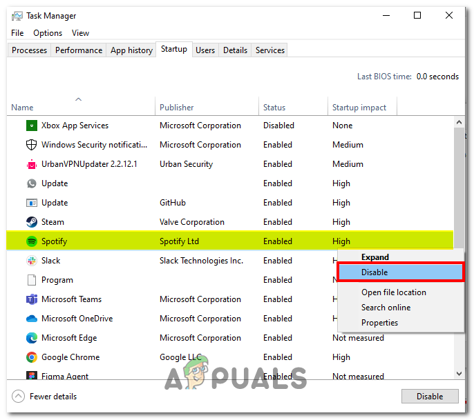 - Disable the startup apps by right-clicking and clicking on the Disable button.
