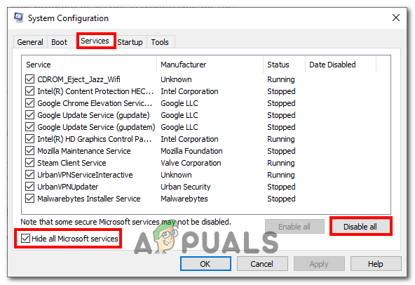 - Check the box that says “Hide all Microsoft services”. This will prevent it from disabling any essential services.