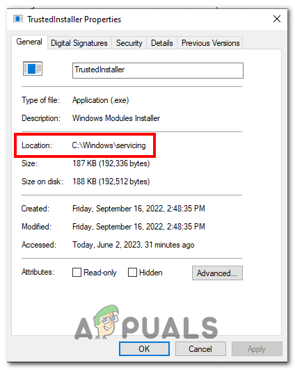 - Open the properties of the TrustedInstaller.exe.