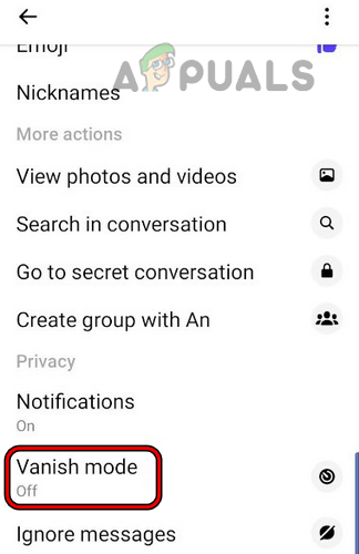 Open Vanish Mode in the Conversation Settings of Messenger - Now enable Vanish Mode by toggling its switch to the on position and afterward, hit the back button twice.