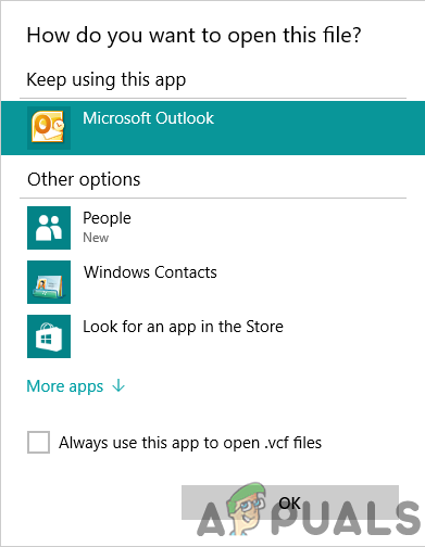 Suggested application to open VCF files - You can also choose Windows Contact to simply view a single contact vCard.
