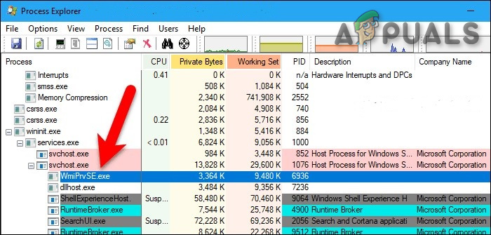 We can also say that, without WmiPrvSE, Windows apps could not be easily managed because the host process that allows the necessary management of services to operate is not functional. Users and administrators would not likely receive notifications when errors occur. In Process Explorer we can see that WmiPrvSE is a child of svchost.exe.