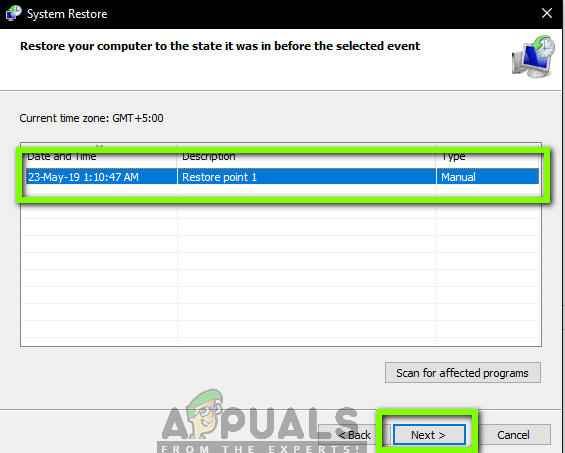 - Now select the restore point from the list of options available. If you have more than one system restore points, they will be listed here. In this example,