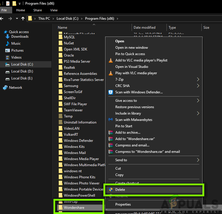 There are several instances where uninstalling the software doesn’t completely remove all the modules from your computer. Normally, whenever you uninstall something, all the linking and leftover files are deleted automatically. However, in some cases, they don’t and this is the case for Wondershare. In this solution, we will be navigating to several different file locations and deleting all the entries of Wondershare manually one by one. Make sure that you have administrator access to perform this method.
