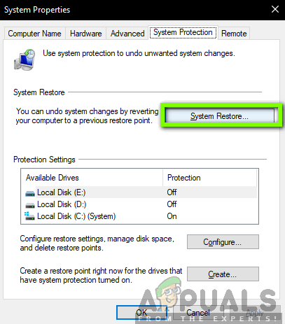 - One in the restore settings, press System Restore present at the beginning of the window under the tab of System Protection.