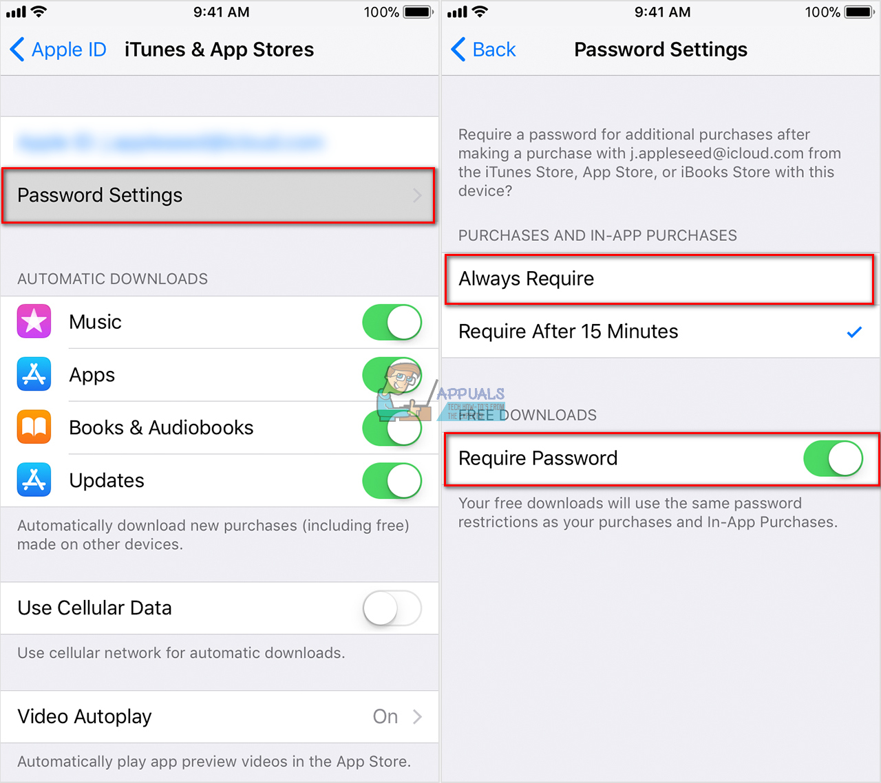 - In the Purchases and In-App Purchases section choose Always Require.