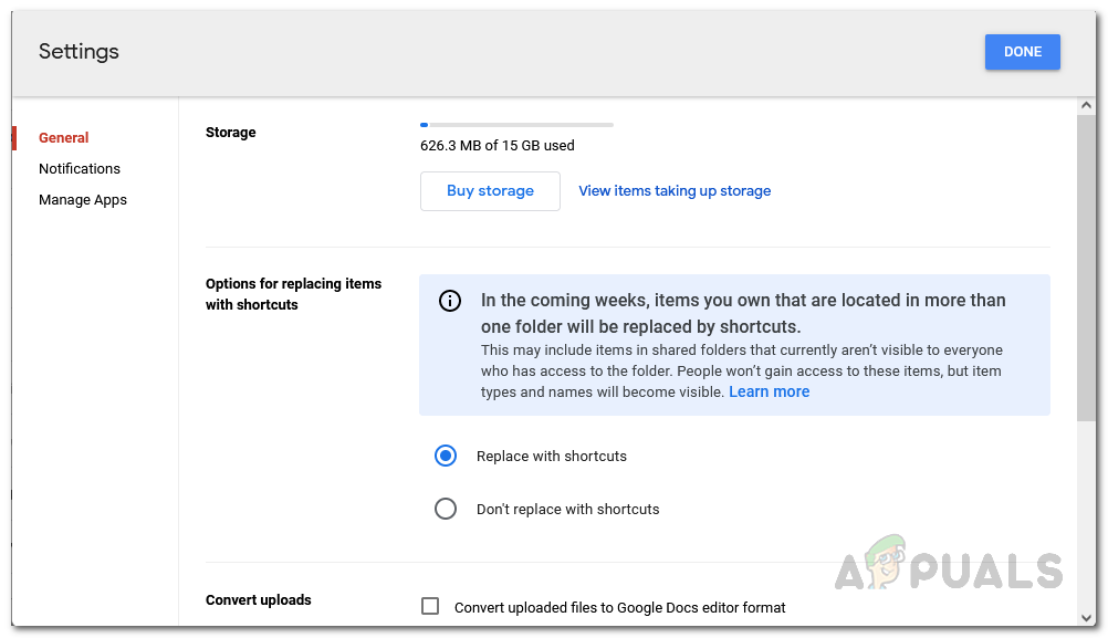 Opening Google Drive Settings - Now, on the Settings menu, switch to the Manage Apps tab on the left hand side.
