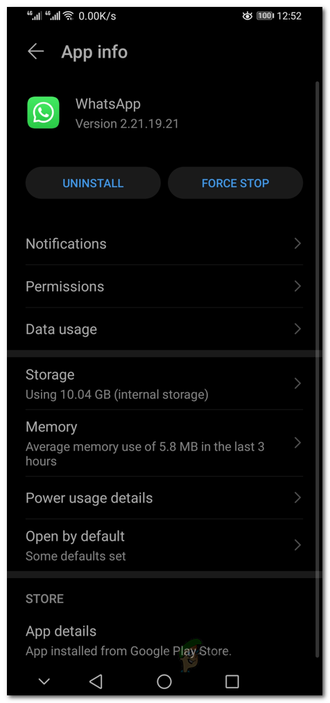 Opening Whatsapp App Info - Once you have found the application, tap the Force Stop button to quit the application.