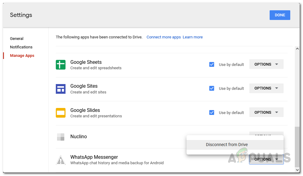 Google Drive Settings Menu - Scroll down and locate the Whatsapp Messenger entry.