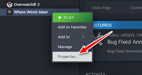 - In Steam, right-click Where Winds Meet and choose Properties.