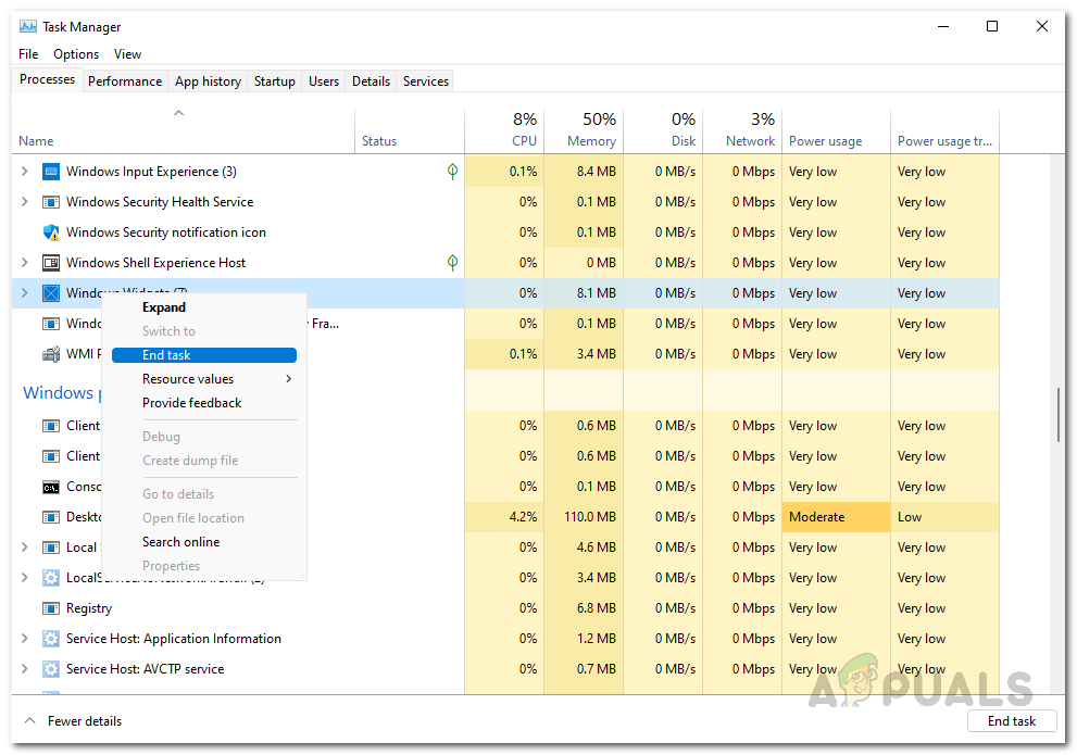 Opening up Task Manager - After that, on the Processes tab of the Task Manager, scroll down and locate the Widgets process.
