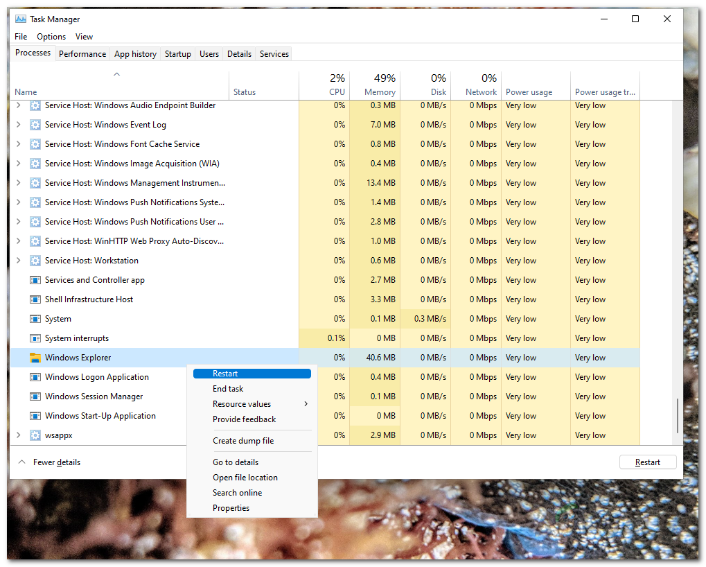 Locating Windows Explorer Process - After locating it, right-click on the process, and from the drop-down menu, click the Restart option.