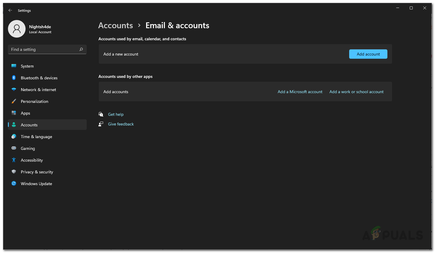 Navigating to Emails and Accounts - Finally, click the Add account button provided if you are using a local account.