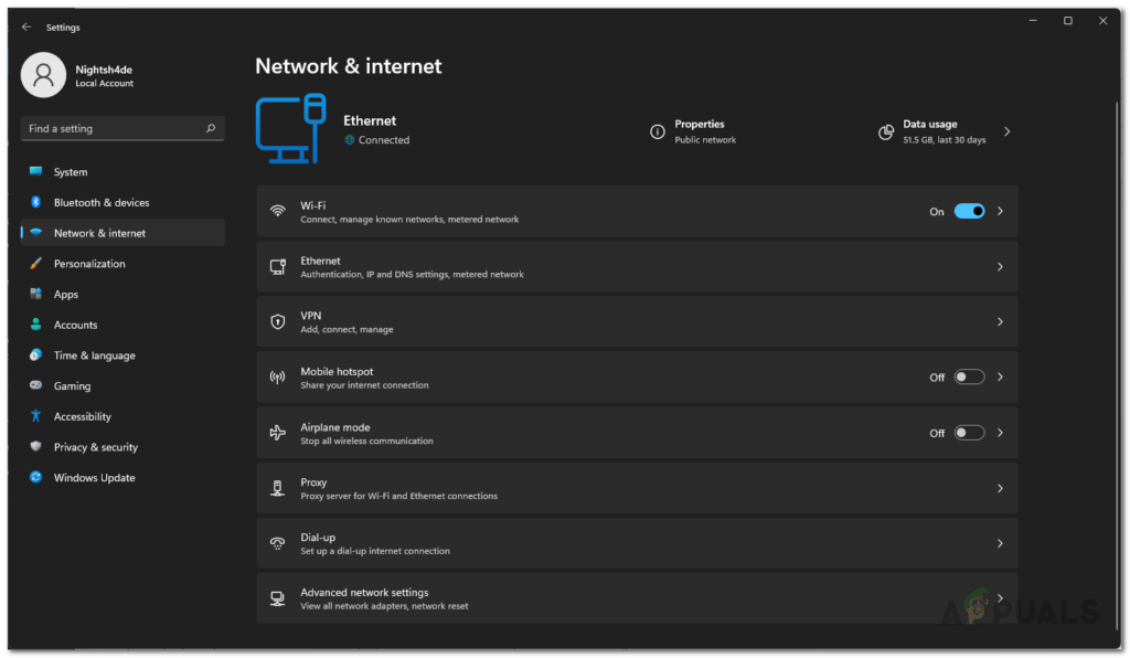- On the left-hand side of the Settings window, switch to the Network and Internet tab.