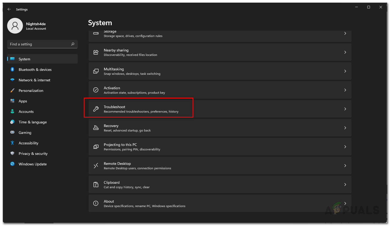 - Then, on the System tab of the Settings window, scroll down a little until you see the Troubleshoot option provided. Open it up.