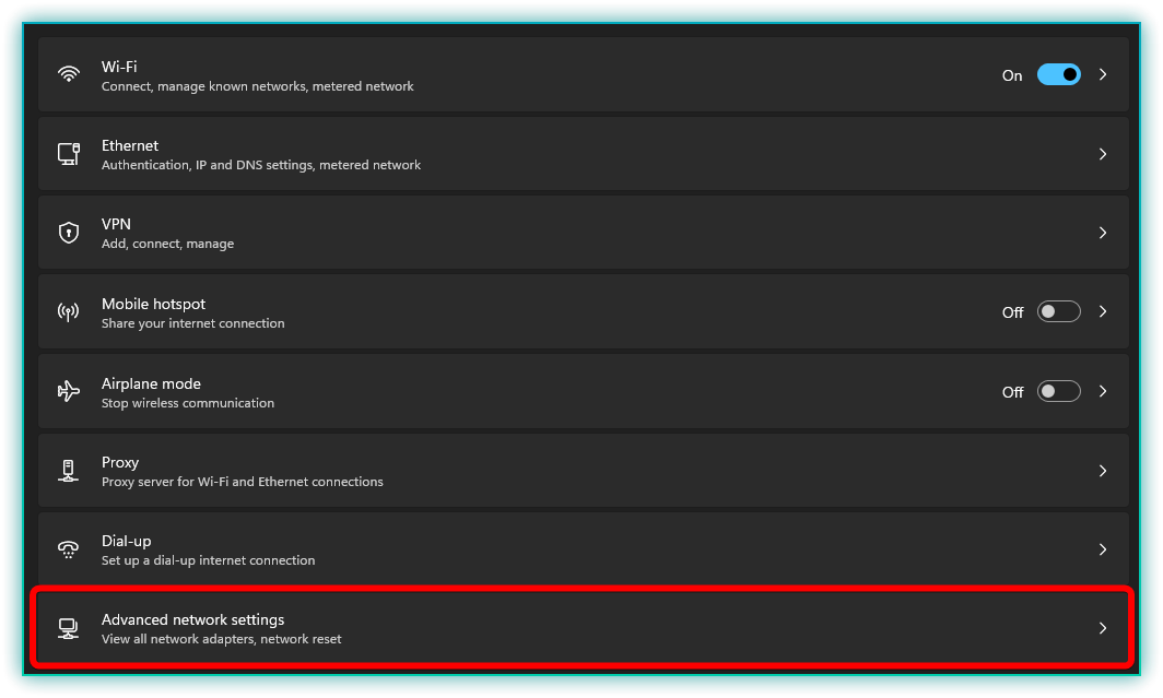 - Scroll down and click on Advanced Network Settings.