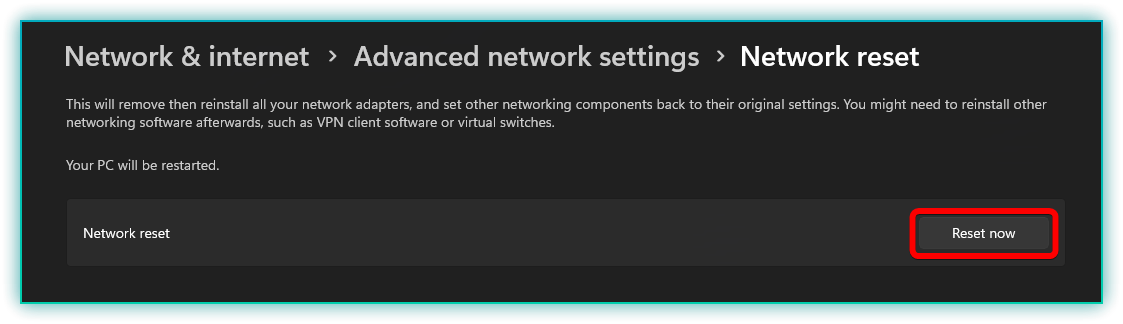 - Click Reset now, then restart your computer when prompted.