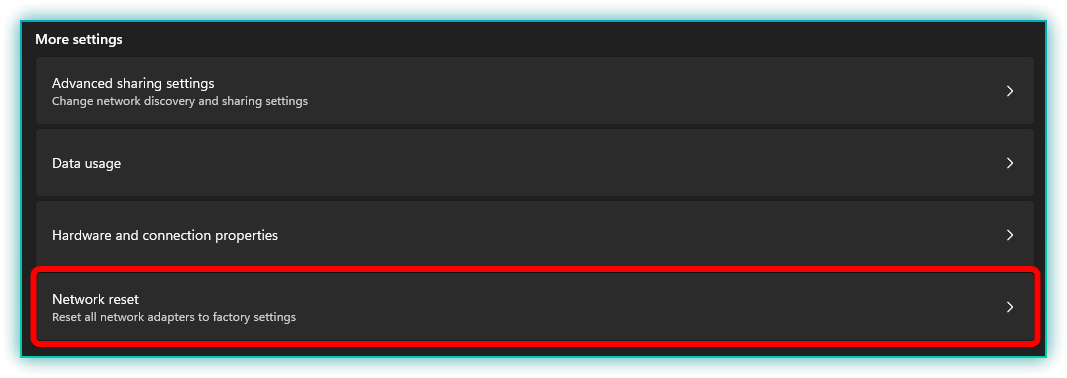 - Under more settings, click on the button labeled Network Reset.