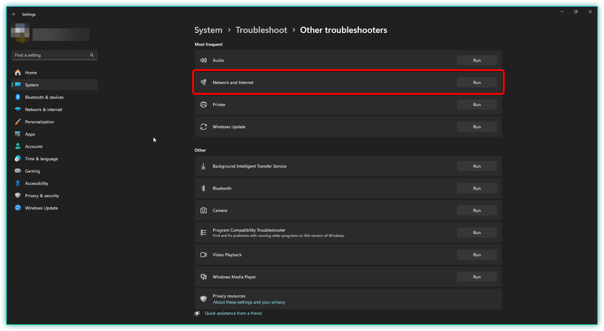 - Select Network and Internet and click on Run. Follow the prompts to see if Windows can identify any issues.