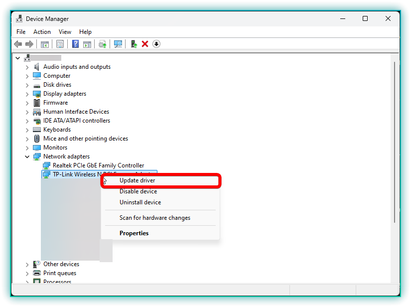 - Right-click on your wireless adapter (it may include “Wireless” or “WiFi” in its name) and select Update driver.