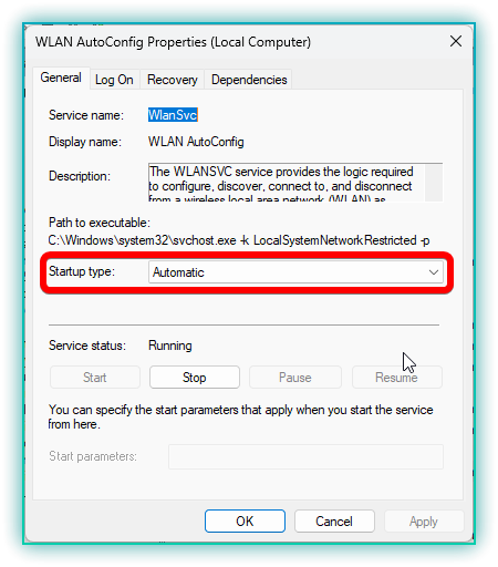- Ensure the Startup type is set to Automatic, then click Start if it’s not running.