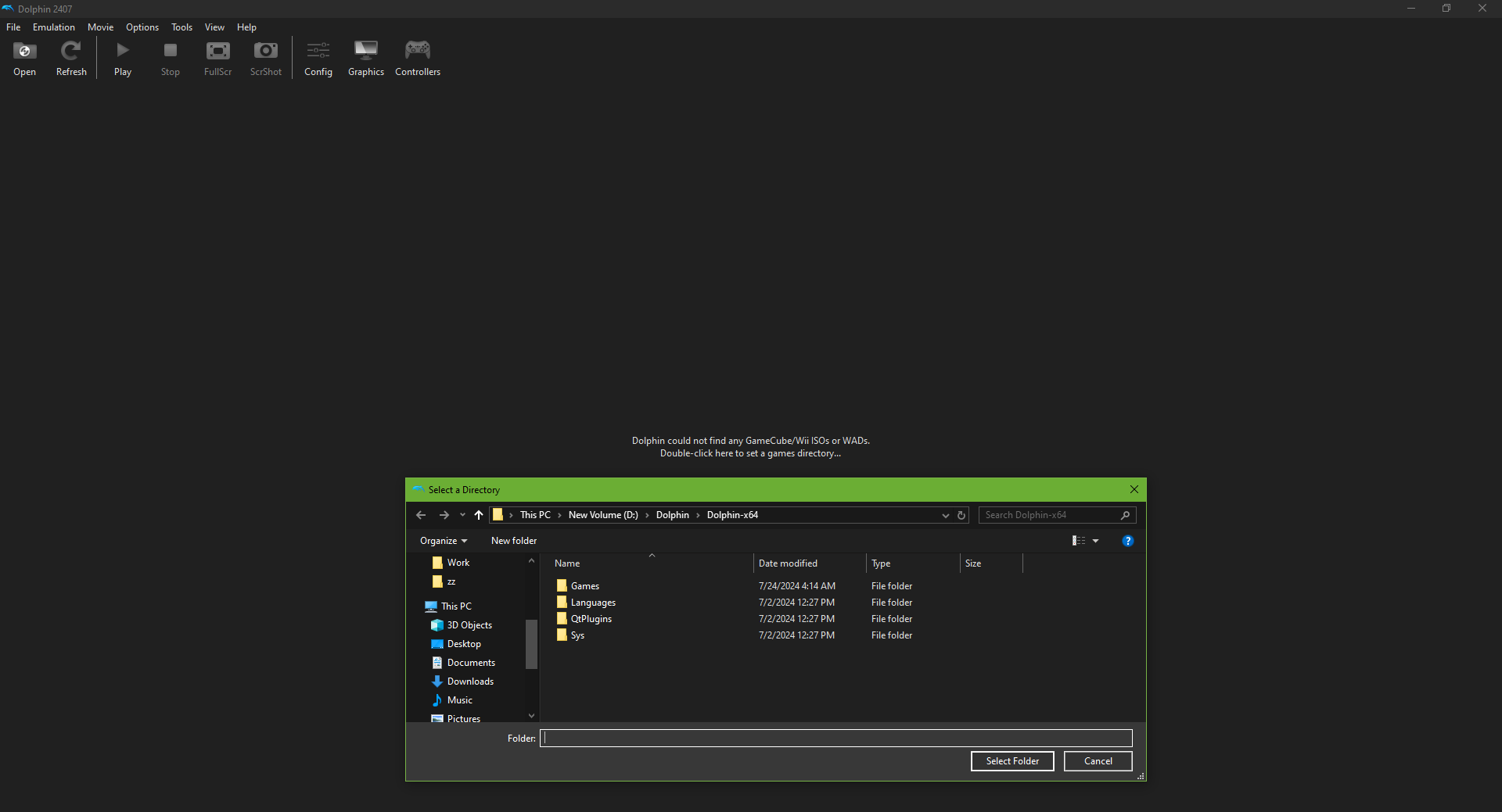 Double-click on “Dolphin.exe” to launch the emulator - The emulator should open up on the screen. Double-click on the empty space to designate a folder for all your games.
