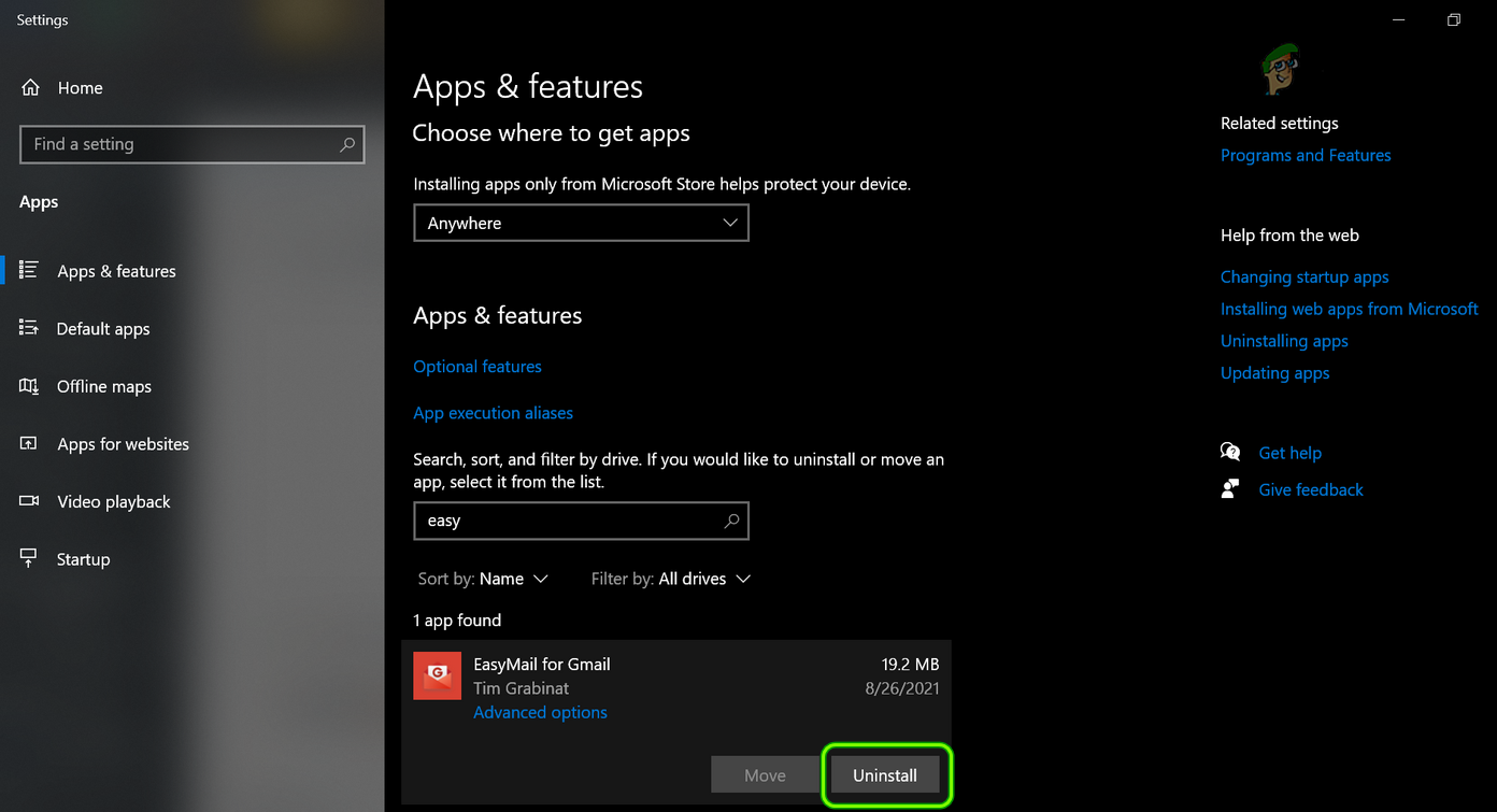 Uninstall EasyMail for Gmail Through the Apps & Features - Then follow the prompts to uninstall the Easy Mail and afterward, check if the system is cleared of the Win32AppBackgroundContext message.