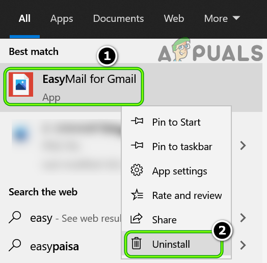 - Right-click on the shortcut icon of the Easy Mail for Gmail and select Uninstall. If there is no shortcut available, then click on Windows and type Easy Mail for Gmail. Now right-click on the EasyMail app and select Uninstall.